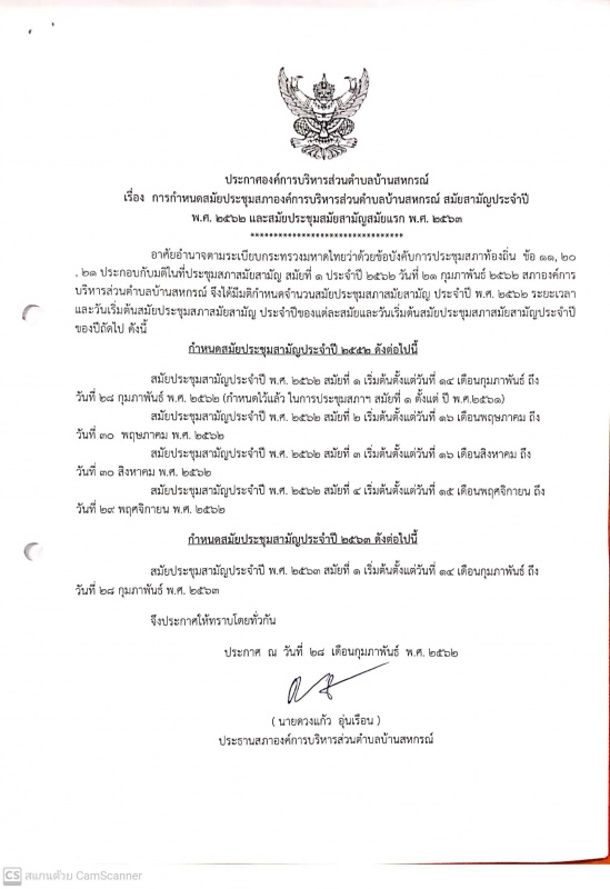 เรื่อง กำหนดสมัยประชุมสภาองค์การบริหารส่วนตำบลบ้านสหกรณ์