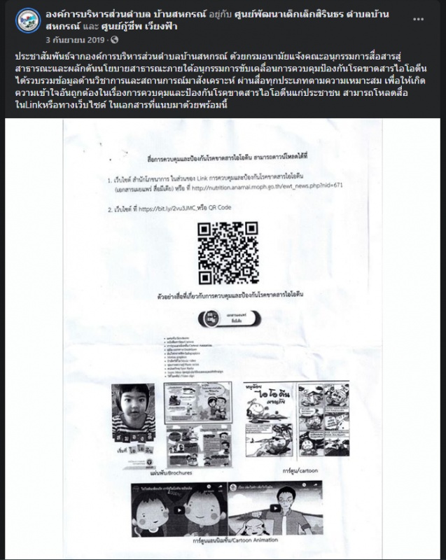 ด้วยกรมอนามัยแจ้งคณะอนุกรรมการสื่อสารสู่สาธารณะและผลักดันนโยบายสาธารณะภายใต้อนุกรรมการขับเคลื่อนการควบคุมป้องกันโรคขาดสารไอโอดีน ได้รวบรวมข้อมูลด้านวิชาการและสถานการณ์มาสังเคราะห์ ผ่านสื่อทุกประเภทตามความเหมาะสม เพื่อให้เกิดความเข้าใจอันถูกต้องในเรื่องการควบคุมและป้องกันโรคขาดสารไอโอดีนแก่ประชาชน สามารถโหลดสื่อในLinkหรือทางเว็บไซต์ ในเอกสารที่แนบมาด้วยพร้อมนี้