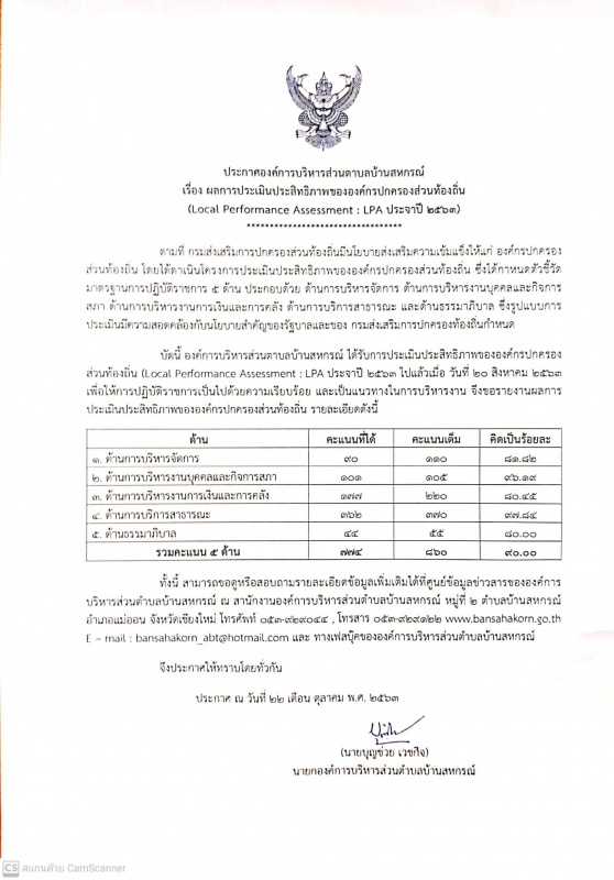 ผลการประเมินประสิทธิภาพขององค์กรปกครองส่วนท้องถิ่น (Local Performance Assessment : LPA ประจำปี 2563)