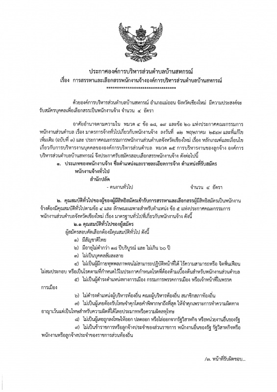 ด้วยองค์การบริหารส่วนตำบลบ้านสหกรณ์ อำเภอแม่ออน จังหวัดเชียงใหม่ มีความประสงค์จะรับสมัครบุคคลเพื่อเลือกสรรเป็นพนักงานจ้างองค์การบริหารส่วนตำบลบ้านสหกรณ์