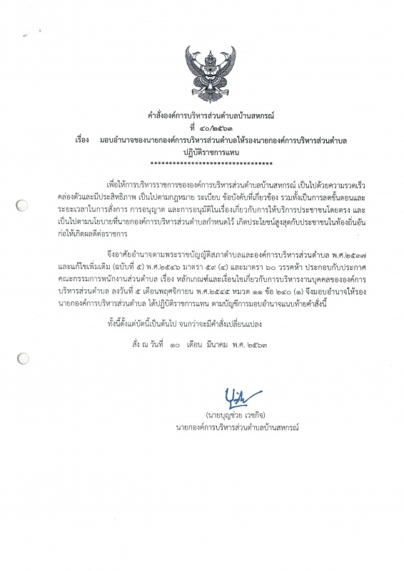 เรื่อง มอบอำนาจของนายกองค์การบริหารส่วนตำบล