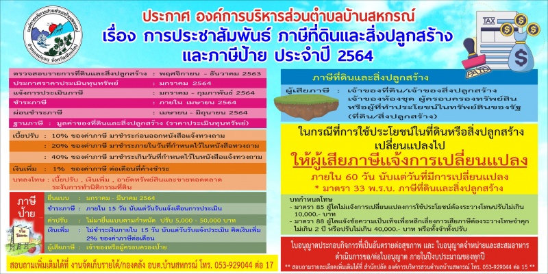 องค์การบริหารส่วนตำบลบ้านสหกรณ์ ขอประชาสัมพันธ์แนวทางทารชำระภาษีที่ดินและสิ่งปลูกสรา้ง รวมทั้งภาษีป้าย ประจำปี 2564