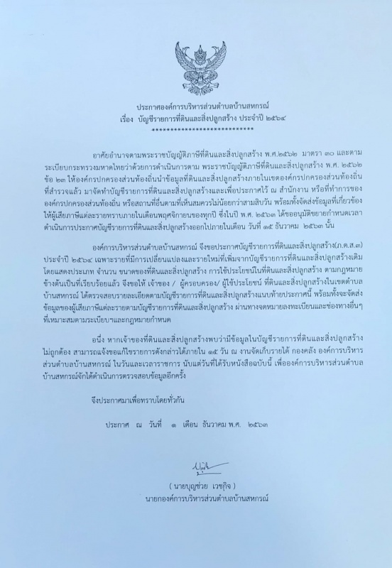 ประกาศ บัญชีรายการที่ดินและสิ่งปลูกสร้าง ประจำปี 2564