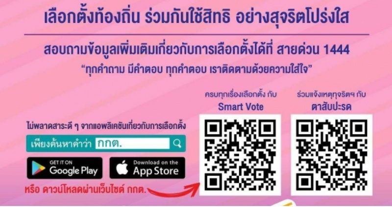 ผ่านทางสายด่วน กกต. โทร. 1444 ร่วมทั้งช่องทางแอพพลิเคชั่น "ตาสับปะรด" และ แอพพลิเคชั่น Smart Vote ดาวน์โหลดได้ที่ App Store และ Google Play #เลือกตั้งท้องถิ่นร่วมกันใช้สิทธิอย่างสุจริตโปร่งใส