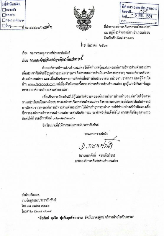 ประชาสัมพันธ์จากองค์การบริหารส่วนตำบลแม่ทา อ.แม่ออน จ.เชียงใหม่