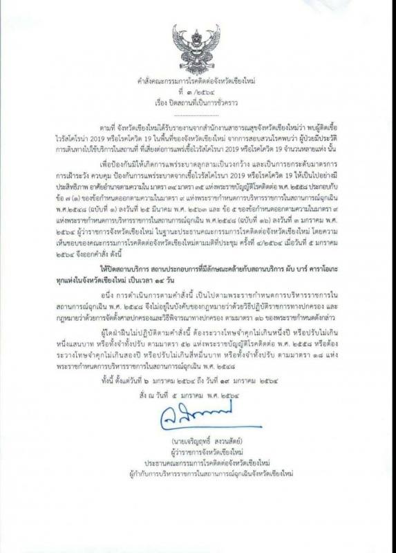 ให้ปิดสถานบริการ สถานประกอบการที่มีลักษณะคล้ายกับสถานบริการ ผับ บาร์ คาราโอเกะ ทุกแห่งในจังหวัดเชียงใหม่ เป็นเวลา 14 วัน ค่ะ