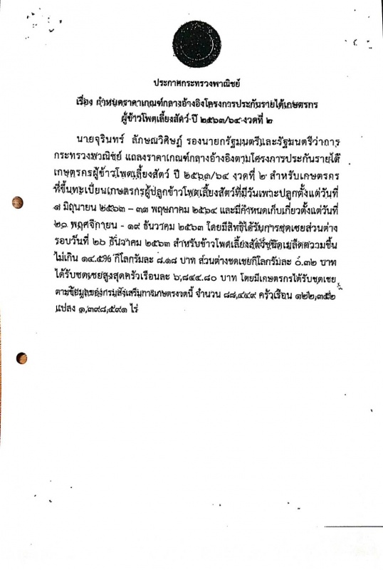 เรื่อง กำหนดราคาเกณฑ์กลางอ้างอิงโครงการประกันรายได้เกษตรกร