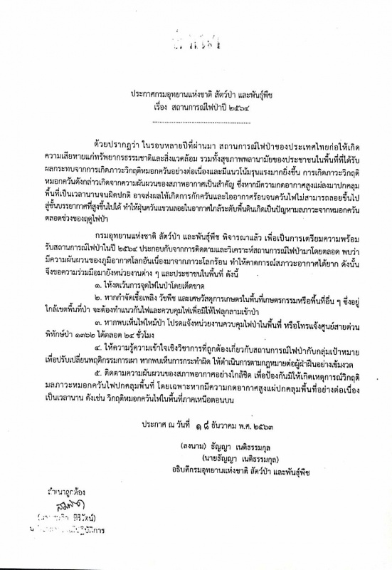 ประกาศกรมอุทยานแห่งชาติ สัตว์ป่า และพันธ์ุพืช เรื่อง สถานการณ์ไฟป่า ประจำปี 2564