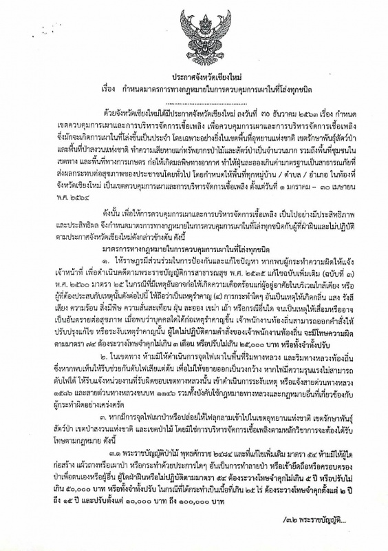 ประกาศจังหวัดเชียงใหม่ เรื่องกำหนดการมาตรการทางกฏหมายในการควบคุมการเผาในที่โล่งทุกชนิด
