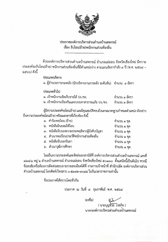 ประกาศองค์การบริหารส่วนตำบลบ้านสหกรณ์ เรื่อง #รับโอน(ย้าย)พนักงานส่วนท้องถิ่น
