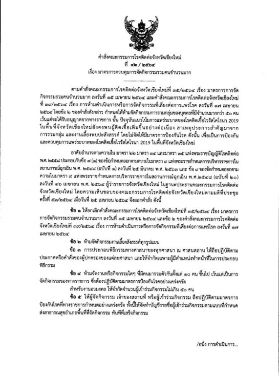 คำสั่งคณะกรรมการโรคติดต่อจังหวัดเชียงใหม่ ที่ 42/2564 เรื่อง มาตรการควบคุมการจัดกิจกรรมรวมคนจำนวนมาก