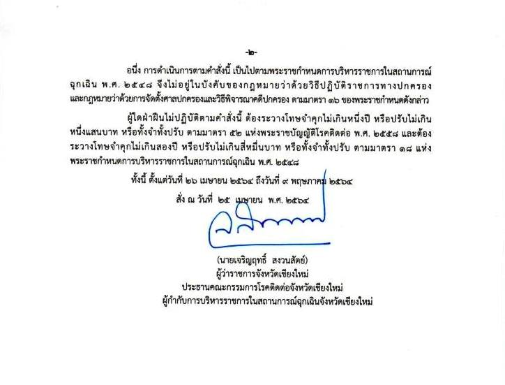 โดยให้ยกเลิกคำสั่งคณะกรรมการโรคติดต่อจังหวัดเชียงใหม่ที่ 35/2564 เรื่อง มาตรการการจัดกิจกรรมรวมคนจำนวนมาก ลงวันที่ 15 เมษายน 2564 และข้อ 2 ของคำสั่งคณะกรรมการโรคติดต่อจังหวัดเชียงใหม่ที่ 39/2564 เรื่อง การห้ามดำเนินการหรือการจัดกิจกรรมที่เสี่ยงต่อการแพร่โรค ลงวันที่ 17 เมษายน 2564 อีกด้วย สำหรับบทกำหนดโทษ ผู้ฝ่าฝืนไม่ปฏิบัติตามคำสั่งนี้ ต้องระวางโทษจำคุกไม่เกิน 1 ปี หรือปรับไม่เกิน 100,000 บาท หรือทั้งจำทั้งปรับ #โดยให้มีผลบังคับใช้ตั้งแต่วันที่ 26 เมษายน 2564 ถึงวันที่ 9 พฤษภาคม 2564