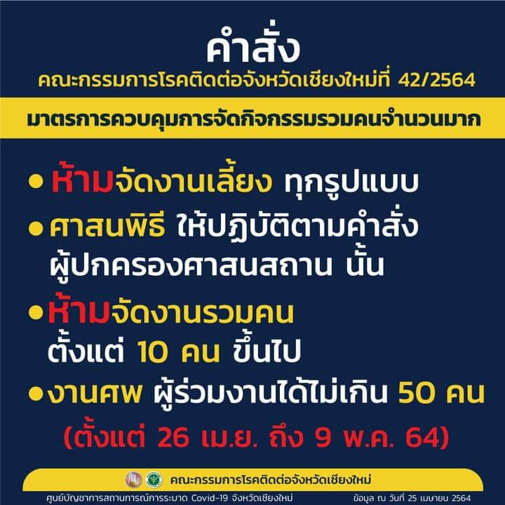 "คำสั่งคณะกรรมการโรคติดต่อจังหวัดเชียงใหม่" ที่ 42/2564 เรื่อง มาตรการควบคุมการจัดกิจกรรมรวมคนจำนวนมาก โดยมีสาระสำคัญ ดังนี้