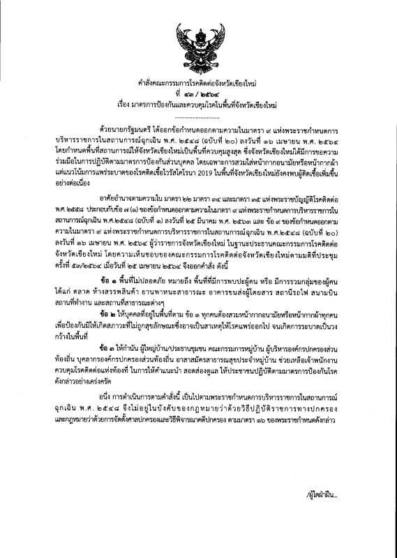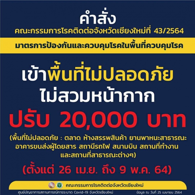 "คำสั่งคณะกรรมการโรคติดต่อจังหวัดเชียงใหม่" ที่ 43/2564 เรื่อง #มาตรการป้องกันและควบคุมโรคในพื้นที่จังหวัดเชียงใหม่ ซึ่งมีสาระสำคัญ ดังนี้ ให้ทุกคน ต้องสวมหน้ากากอนามัยหรือหน้ากากผ้า เมื่อเข้าไปยัง ?พื้นที่ไม่ปลอดภัย? เพื่อป้องกันมิให้เกิดสภาวะที่ไม่ถูกสุขลักษณะซึ่งอาจเป็นสาเหตุให้โรคแพร่ออกไป จนเกิดการระบาดเป็นวงกว้างในพื้นที่ โดย คำสั่งที่ 43/2564 ได้นิยาม ?พื้นที่ไม่ปลอดภัย? หมายถึง พื้นที่ที่มีการพบปะผู้คน หรือ มีการรวมกลุ่มของผู้คน อันได้แก่ ตลาด ห้างสรรพสินค้า ยานพาหนะสาธารณะ อาคารขนส่งผู้โดยสาร สถานีรถไฟ สนามบิน สถานที่ทำงาน และสถานที่สาธารณะต่างๆ พร้อมกันนี้ คำสั่งฉบับนี้ ยังสั่ง ?ให้กำนัน ผู้ใหญ่บ้าน ประธานชุมชน คณะกรรมการหมู่บ้าน ผู้บริหารองค์กรปกครองส่วนท้องถิ่น บุคลากรองค์กรปกครองส่วนท้องถิ่น อาสาสมัครสาธารณสุขประจำหมู่บ้าน ช่วยเหลือเจ้าพนักงานควบคุมโรคติดต่อแห่งท้องที่ ในการให้คำแนะนำ สอดส่องดูแล ให้ประชาชนปฏิบัติตามมาตรการป้องกันโรค ดังกล่าวอย่างเคร่งครัด ส่วนบทกำหนดโทษ ระบุไว้ว่า ?ผู้ใดฝ่าฝืนไม่ปฏิบัติตามคำสั่งนี้ และคำสั่งเจ้าพนักงานควบคุมโรคติดต่อ ต้องระวางโทษปรับไม่เกิน 20,000 บาท? #โดยให้มีผลบังคับใช้ตั้งแต่วันที่ 26 เมษายน 2564 ถึงวันที่ 9 พฤษภาคม 2564