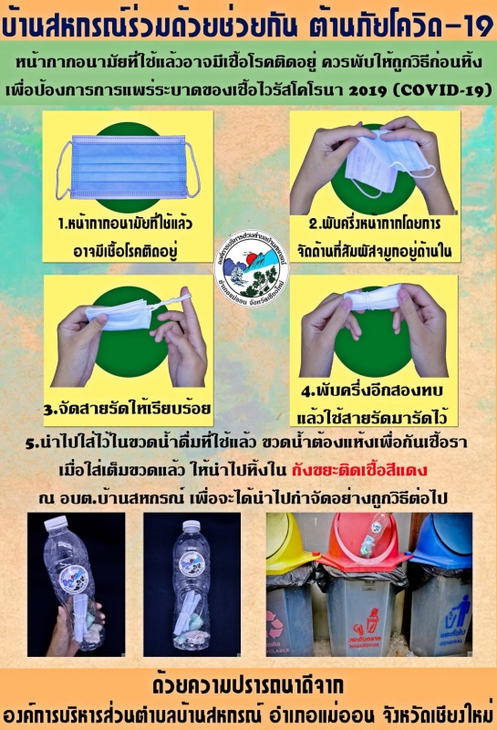 เนื่องจากสถานการณ์ การแพร่ระบาดของโรคติดเชื้อไวรัสโคโรนา 2019 (COVID-19) "ระลอกที่ 3" องค์การบริหารส่วนตำบลบ้านสหกรณ์ อำเภอแม่ออน จังหวัดเชียงใหม่ จึงขอแจ้งประชาสัมพันธ์แนวทางการทิ้งหน้ากากอนามัยที่ใช้แล้ว เนื่องจาก #หน้ากากอนามัยที่ใช้แล้วถือเป็นขยะติดเชื้อชนิดหนึ่ง ดังนั้นเพื่อเป็นการป้องกันการแพร่ระบาดของเชื้อโรค เราควรทิ้งหน้ากากอนามัยอย่างถูกวิธี โดยจุดทิ้งขยะติดเชื้อ (ถังขยะสีแดง) ตั้งอยู่ที่ องค์การบริหารส่วนตำบลบ้านสหกรณ์ อำเภอแม่ออน จังหวัดเชียงใหม่ค่ะ ![]()