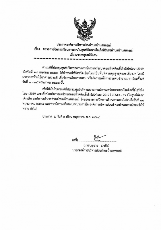 ประกาศองค์การบริหารส่วนตำบลบ้านสหกรณ์ เรื่อง ขยายการปิดการเรียนการสอนศูนย์พัฒนาเด็กเล็กสิรินธรตำบลบ้านสหกรณ์ เนื่องจากเหตุกรณีพิเศษ