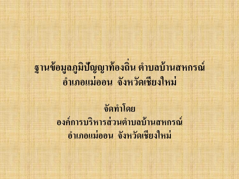 | 1 | ปรับปรุงฐานข้อมูลภูมิปัญญาท้องถิ่น ประจำปี 2563 ตำบลบ้านสหกรณ์ อำเภอแม่ออน จังหวัดเชียงใหม่ | 923 KB. | 250 |