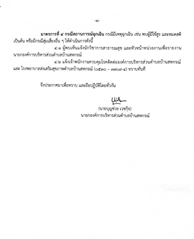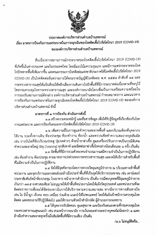 ประกาศองค์การบริหารส่วนตำบลบ้านสหกรณ์ เรื่องมาตรการป้องกันการแพร่ระบาดในภาวะฉุกเฉินของโรคติดเชื้อไวรัสโคโรนา 2019