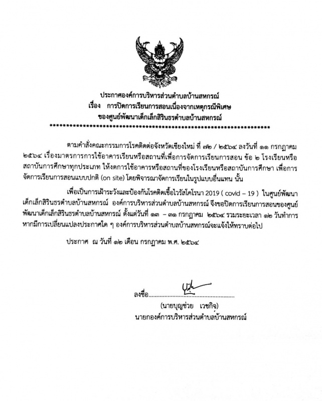 ปิดศูนย์พัฒนาเด็กเล็กสิรินธร ตำบลบ้านสหกรณ์ ตั้งแต่ 13 - 31 ก.ค. 2564
