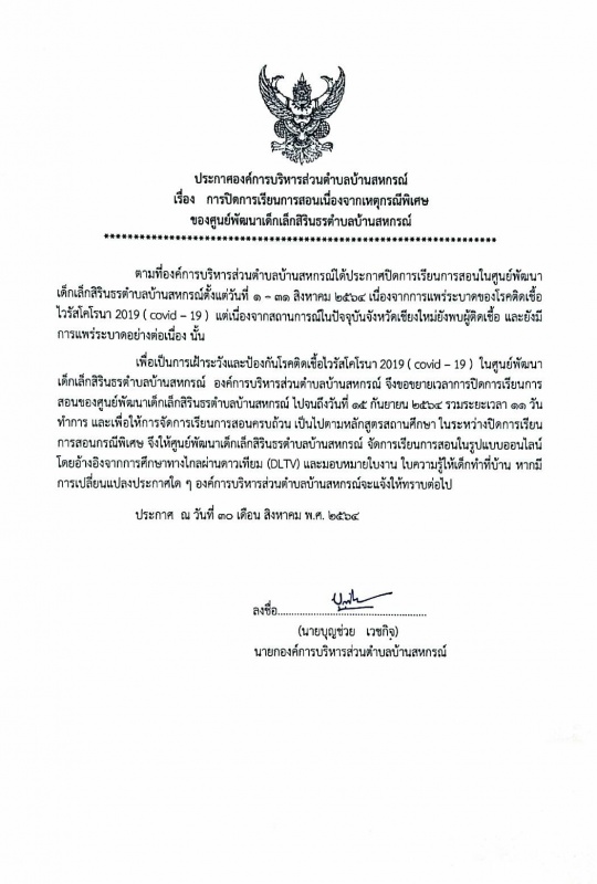 การปิดการเรียนการสอนเนื่องจากเหตุกรณีพิเศษ ของศูนย์พัฒนาเด็กเล็กสิรินธรตำบลบ้านสหกรณ์