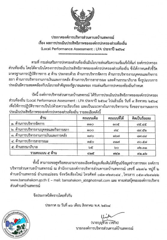 ผลการประเมินประสิทธิภาพขององค์กรปกครองส่วนท้องถิ่น (Local Performance Assessment : LPA) ประจำปี 2564