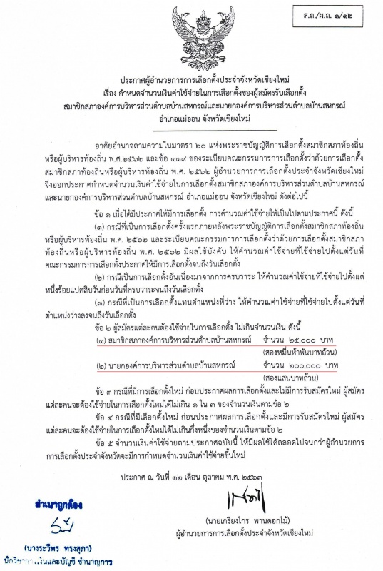 เรื่อง #กำหนดจำนวนเงินค่าใช้จ่ายในการเลือกตั้งของผู้สมัครรับเลือกตั้งสมาชิกสภาฯและนายก