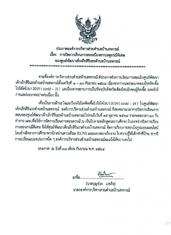 ขยายเวลาการปิดศูนย์พัฒนาเด็กเล็กสิรินธรตำบลบ้านสหกรณ์