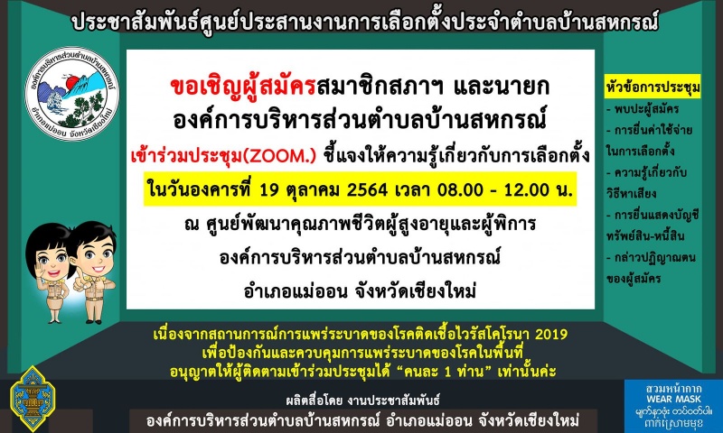 เรียนเชิญผู้สมัครรับเลือกตั้งสมาชิกสภาฯ และนายกองค์การบริหารส่วนตำบลบ้านสหกรณ์ เข้าร่วมรับฟังการประชุม"ผ่านแอปพลิเคชั่น ZOOM" ชี้แจงให้ความรู้เกี่ยวกับการเลือกตั้งเชิงสมานฉันท์