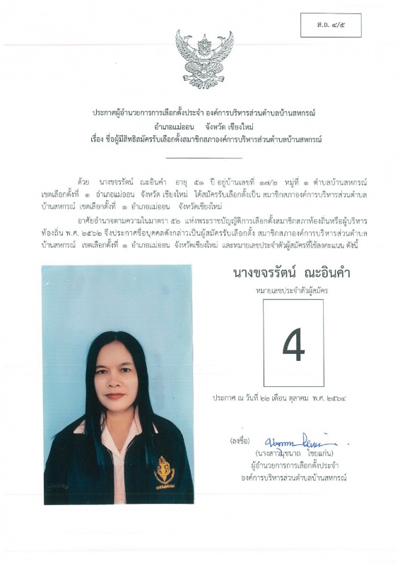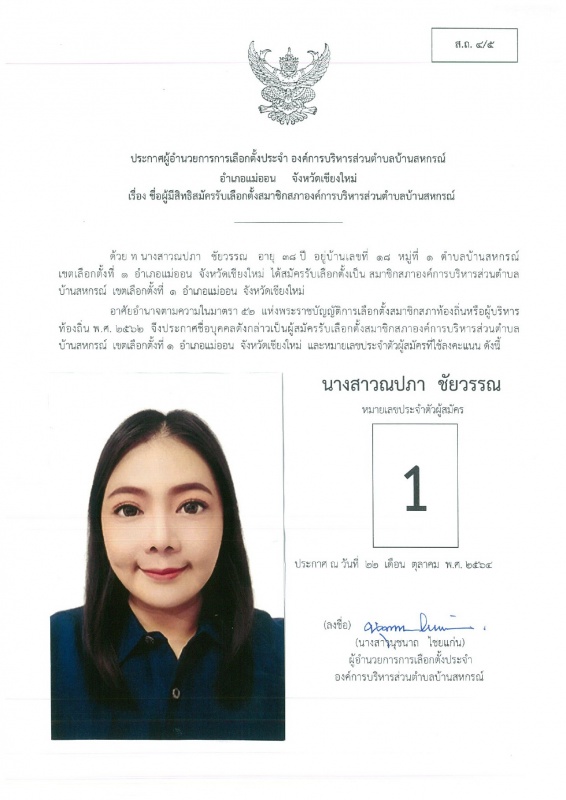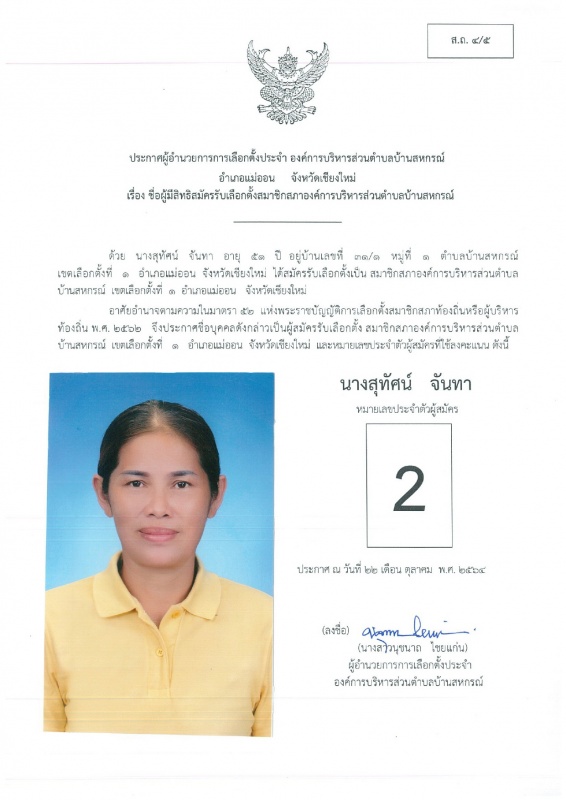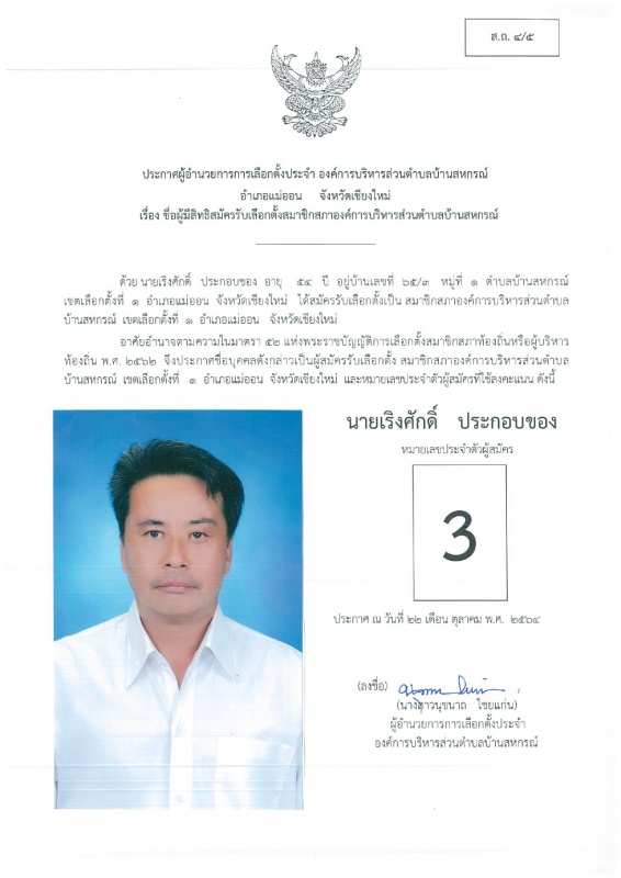 ประกาศ บัญชีรายชื่อผู้สมัครรับเลือกตั้งสมาชิกสภาองค์การบริหารส่วนตำบลบ้านสหกรณ์ เขตเลือกตั้งที่ 1