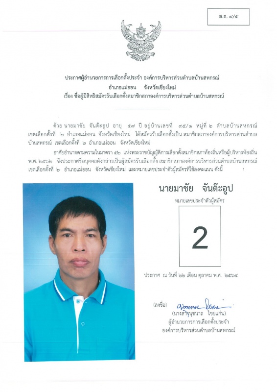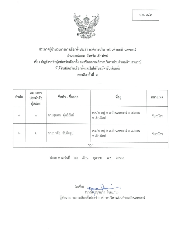 ประกาศ บัญชีรายชื่อผู้สมัครรับเลือกตั้งสมาชิกสภาองค์การบริหารส่วนตำบลบ้านสหกรณ์ เขตเลือกตั้งที่ 2