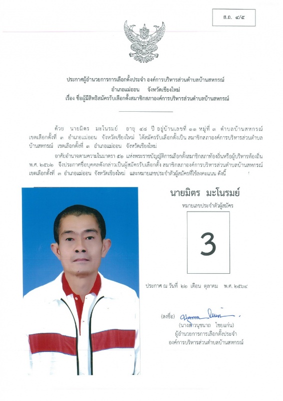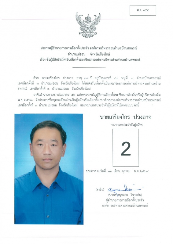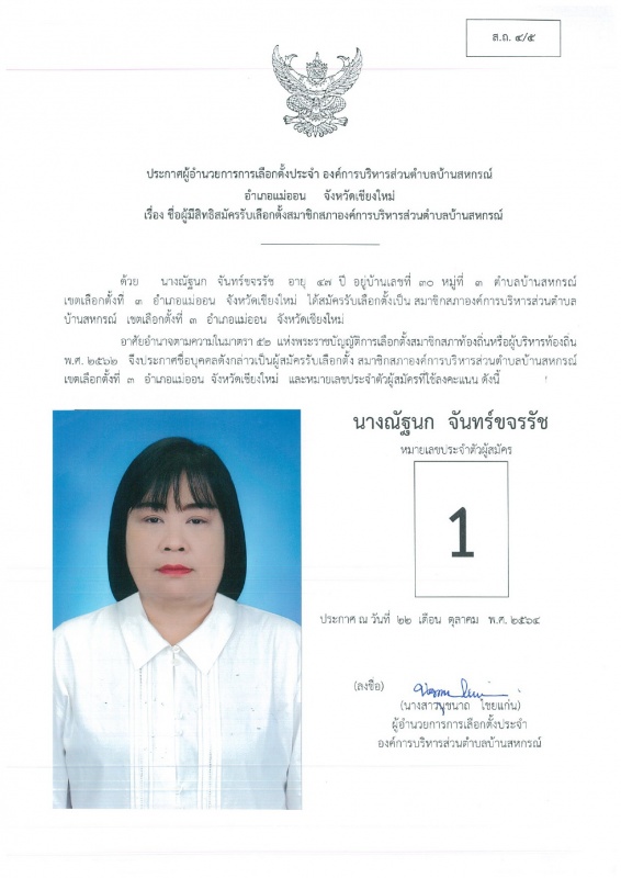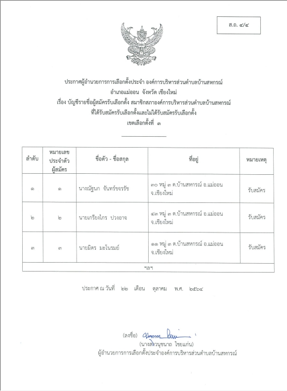 ประกาศ บัญชีรายชื่อผู้สมัครรับเลือกตั้งสมาชิกสภาองค์การบริหารส่วนตำบลบ้านสหกรณ์ เขตเลือกตั้งที่ 3