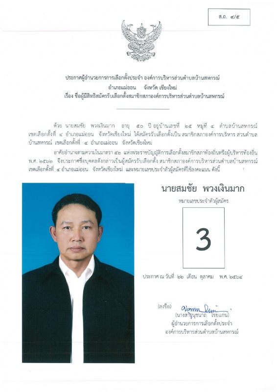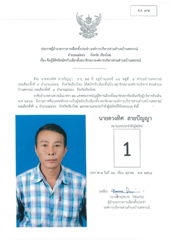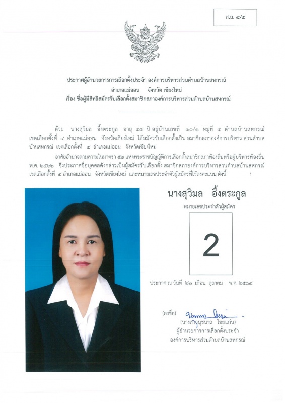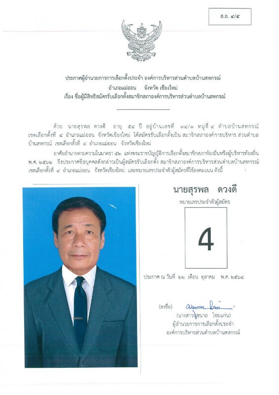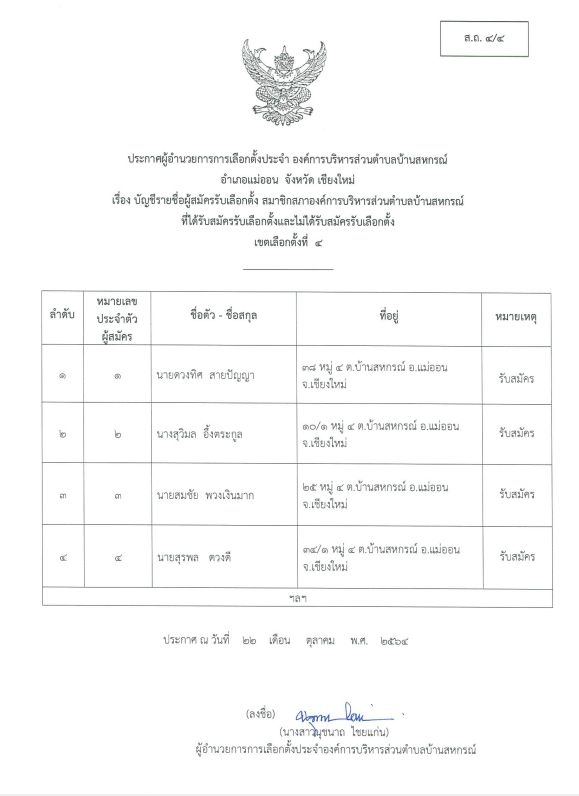 ประกาศ บัญชีรายชื่อผู้สมัครรับเลือกตั้งสมาชิกสภาองค์การบริหารส่วนตำบลบ้านสหกรณ์ เขตเลือกตั้งที่ 4