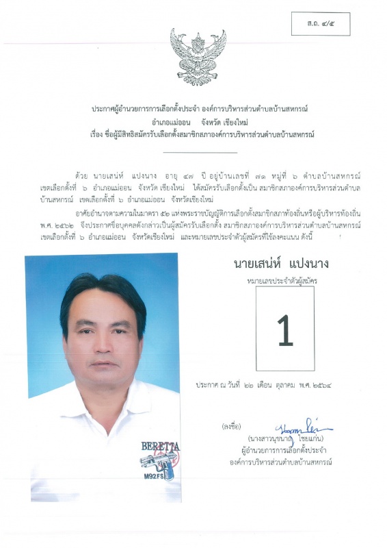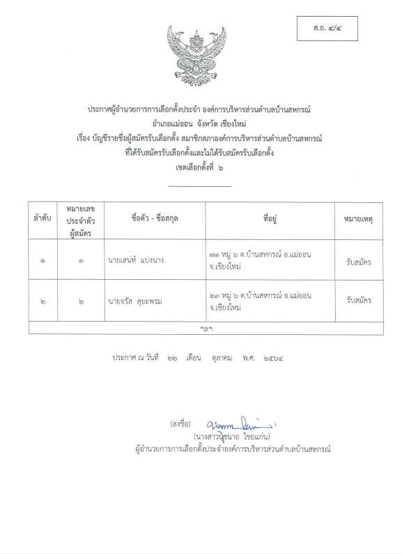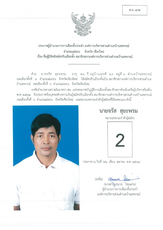 ประกาศ บัญชีรายชื่อผู้สมัครรับเลือกตั้งสมาชิกสภาองค์การบริหารส่วนตำบลบ้านสหกรณ์ เขตเลือกตั้งที่ 6