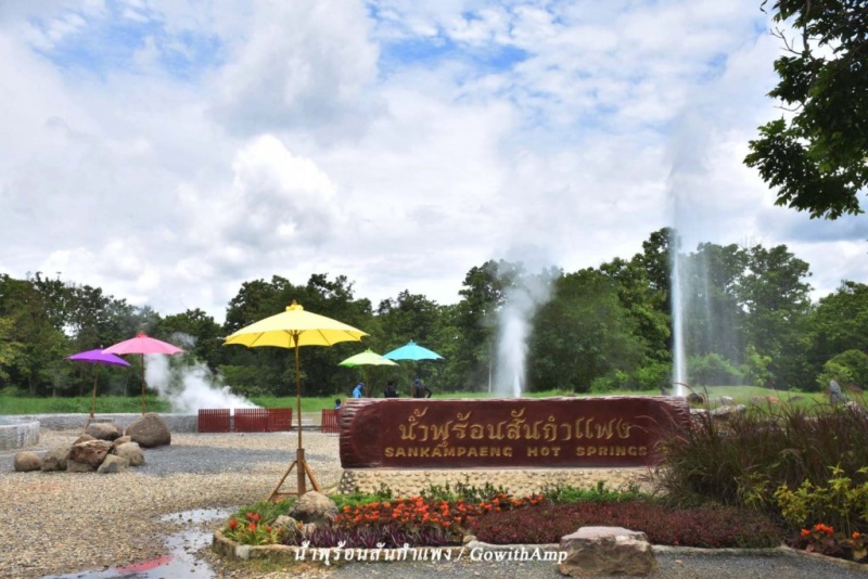 ตั้งอยู่เลขที่ 1 หมู่ที่ 7 ตำบลบ้านสหกรณ์ กิ่งอำเภอแม่ออน จังหวัดเชียงใหม่ ดำเนินงานโดยการท่องเที่ยวแห่งประเทศไทย (ททท.) ร่วมกับสหกรณ์การเกษตรหมู่บ้านสหกรณ์สันกำแพง จำกัด เป็นสถานที่ท่องเที่ยวพักผ่อนหย่อนใจสำหรับผู้ที่รักความเป็นธรรมชาติ เพราะสถานที่แห่งนี้โอบล้อมไปด้วยภูเขา ต้นไม้นานาพันธุ์ ดอกไม้สีสันสดใส น้ำพุร้อนที่โพยพุ่งขึ้นสูงกว่า 10 เมตร อุณหภูมิสูงถึง 105 องศาเซลเซียส สามารถต้มไข่ให้สุกได้ในเวลาไม่ถึง 10 นาที ด้วยพลังงานความร้อนใต้พิภพแห่งนี้ นอกจากจะได้เพลิดเพลินกับธรรมชาติแล้ว ยังจะได้ประโยชน์กับสุขภาพอีกด้วย คือ สถานที่แห่งนี้ยังมีบริการอาบน้ำแร่ธรรมชาติ 100 เปอร์เซ็นต์ หลังจากแช่น้ำแร่แล้วยังมีบริการนวดแผนไทยและนวดฝ่าเท้า จากหมอนวดที่ผ่านการอบรมการนวดแผนไทยจากองค์การบริหารส่วนตำบลบ้านสหกรณ์ และมีประสบการณ์การนวดมานานหลายปี เสร็จแล้วดื่มน้ำสมุนไพรจากกลุ่มแม่บ้านตำบลบ้านสหกรณ์อีก นี่แหละธรรมชาติสร้างสรรค์ ทำให้นักท่องเที่ยวที่มาเที่ยวชมและได้สัมผัสน้ำพุร้อนสันกำแพงแล้ว กลับเป็นหนุ่มเป็นสาว สุขภาพแข็งแรงจิตใจเบิกบานแจ่มใส พร้อมที่จะต่อสู้กับหน้าที่การงานต่อไป